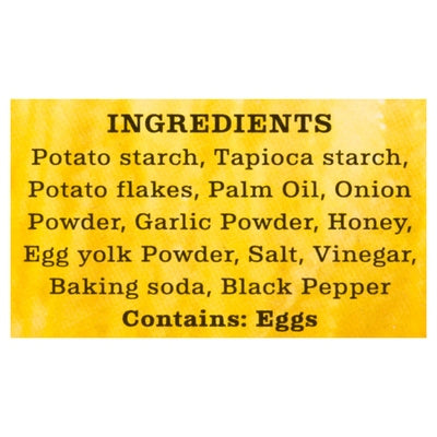 INGREDIENTS: Potato Starch, Tapioca Starch, Potato Flakes, Palm Oil, Onion Powder, Garlic Powder, Honey, Egg Yolk Powder, Salt, Vinegar, Baking Soda, Black Pepper.