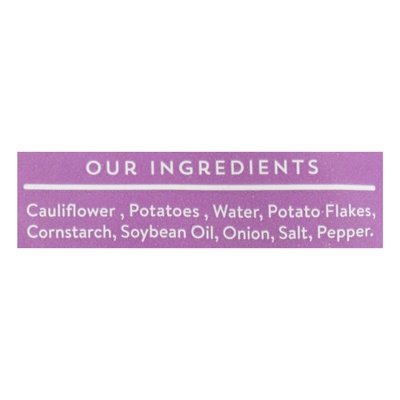 INGREDIENTS: Cauliflower, Potatoes, Water, Potato Flakes, Cornstarch, Soybean Oil, Onion, Salt, Pepper.
