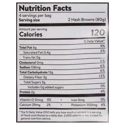 PRODUCT DETAILS: Individually quick frozen sweet potato, potato and onion hash brown coated in a potato flake. Savoury and natural, sweet potato hash browns. One Serving: (80 g as consumed oven cooked) contains: 120 calories (6%); 6 g fat (9%); 0.4 g saturates (2%); 3 g sugars (3%); 138 mg sodium (6%). The % daily value tells you how much a nutrient in a serving of food contributes to a daily diet. 2,000 calories a day is used for general nutritional advice. Certified gluten free. gfco.org. Vegan. Zero trans fat. Non GMO verified. 100% all natural ingredients. Nuff said, they are the G.O.A.T! Having grown up on a farm, our founder has always known the importance of Strong Roots. Staying true to our roots and vegetables grown in rich soil - we serve food that fills you up and keeps you grounded. Scan with your smartphone for recipes, to say hello or to find out more. Certified B Corporation. Produced and packed in USA for Strong Roots.