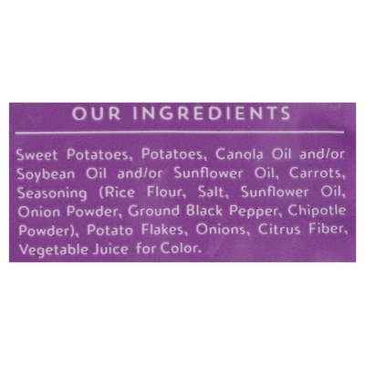 INGREDIENTS: Our Ingredients: Sweet Potatoes, Potatoes, Canola Oil and/or Soybean Oil and/or Sunflower Oil, Carrots, Seasoning (Rice Flour, Salt, Sunflower Oil, Onion Powder, Ground Black Pepper, Chipotle Powder), Potato Flakes, Onions, Citrus Fiber, Vegetable Juice for Color.
