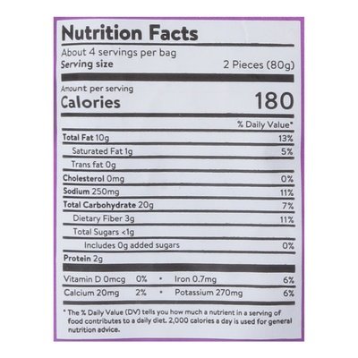PRODUCT DETAILS: A crisp and mouthwatering mix of zucchini, spinach and potato, Bringing the hash brown to the next level. One serving 2 hash browns (80g as consumed oven cooked) contains: Energy: 180 kcal (9%).Fat 10g (13%) Saturated Fat. 1g (5%). Sugars. <1g (0%) Sodium 250mg (11%). 180 calories per serving. 0 grams trans fat. Vegan. No added sugars. The % Daily Value (DV) tells you how much a nutrient in a serving of food contributes to a daily diet 2,000 calories a day is used for general nutrient advice. Strong roots, Having grown up on a farm, our founder has always known the importance of strong roots, Staying true to our roots and vegetables grown in rich soil- we serve food that fills you up and keeps you grounded backofpack(at)strongroots,com Scan with your smartphone for recipes, to say hello or to find out more Produced and packed in USA