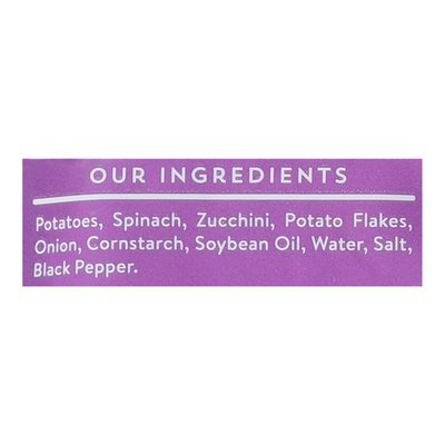 INGREDIENTS: Potatoes, Spinach, Zucchini, Potato Flakes, Onion, Cornstarch, Soybean Oil, Water, Salt, Black Pepper, Individually Quick Frozen Potatoes, Spinach And Zucchini Hash Brown, Coated In Potato Flakes