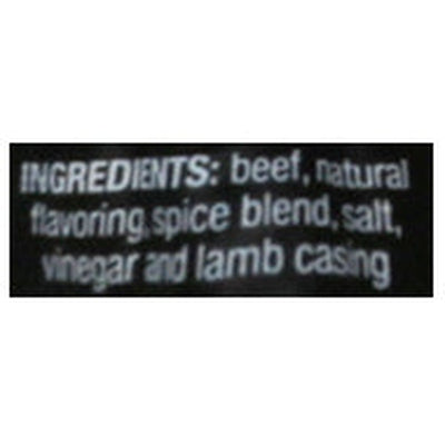 INGREDIENTS: Beef, Natural Flavoring, Spice Blend, Salt, Vinegar and Lamb Casing.