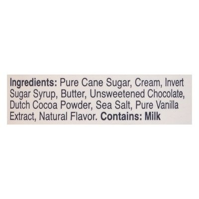 INGREDIENTS: Pure Cane Sugar, Cream, Invert Sugar Syrup, Butter, Unsweetened Chocolate, Dutch Cocoa Powder, Sea Salt, Pure Vanilla Extract, Natural Flavor.