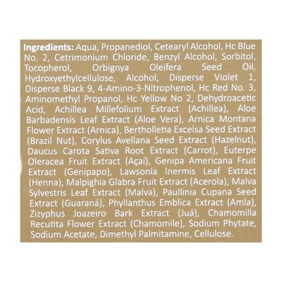 INGREDIENTS: Aqua, Propanediol, Cetearyl Alcohol, Hc Blue 2, Cetrimonium Chloride, Benzyl Alcohol, Sorbitol, Tocopherol, Orbignya Oleifera Seed Oil, Hydroxyethylcellulose, Alcohol, Disperse Violet 1, Disperse Black 9, 4-Amino-3-Nitrophenol, Hc Red 3, Aminomethyl Propanol, Hc Yellow 2, Dehydroacetic Acid, Achillea Millefolium Extract (Achillea), Aloe Barbadensis Leaf Extract (Aloe Vera), Arnica Montana Flower Extract (Arnica), Bertholletia Excelsa Seed Extract (Brazil Nut), Corylus Avellana Seed Extract (Hazelnut), Daucus Carota Saliva Root Extract (Carrot), Euterpe Oleracea Fruit Extract (Acai), Genipa Americana Fruit Extract (Genipapo), Lawsonia Inermis Leaf Extract (Henna), Malpighia Glabra Fruit Extract (Acerola), Maiva Sylvestris Leaf Extract (Malva), Paullinia Cupana Seed Extract (Guarana), Phyllanthus Emblica Extract (Amla), Zizyphus Joazeiro Bark Extract (Jus), Chamomilla Recutita Flower Extract (Chamomile), Sodium Phytate, Sodium Acetate, Dimethyl Palmitamine, Cellulose.