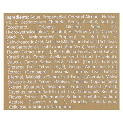 INGREDIENTS: Aqua, Propanediol, Cetearyl Alcohol, He Blue 2, Cetrimonium Chloride, Benzyl Alcohol, Sorbitol, Tocopherol, Orbignya Oleifera Seed Oil, Hydroxyethylcellulose, Alcohol, He Yellow 4, Disperse Black 9, Aminomethyl Propanol, He Red 3, Dehydroacetic Acid, Achillea Millefolium Extract (Achillea), Aloe Barbadensis Leaf Extract (Aloe Vera), Arnica Montana Flower Extract (Arnica), Bertholletia Excelsa Seed Extract (Brazil, Nut), Corylus Avellana Seed Extract (Hazelnut), Daucus Carota Sativa Root Extract (Carrot), Euterpe Oleracea Fruit Extract (Alai), Genipa Americana Fruit Extract (Genipapo), Lawsonia Inermis Leaf Extract (Henna), Malpighia Glabra Fruit Extract (Acerola), Malva Sylvestris Leaf Extract (Malva), Paullinia Cupana Seed Extract (Guarana), Phyllanthus Emblica Extract (Amla), Zizyphus Joazeiro Bark Extract (Lua), Chamomilla Recutita Flower Extract (Chamomile),Sodium Phytate, Sodium Acetate, Disperse Violet 1, Dimethyl Palmitamine, Cellulose, 4-Amino-3-Nitrophenol. This kit contains: - 01 Bottle of Henna Cream - 01 Pair of plastic gloves - 01 Plastic cap - 01 Instructions guide.