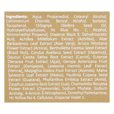 INGREDIENTS: Aqua, Propanediol, Cetearyl Alcohol, Cetrimonium Chloride, Benzyl Alcohol, Sorbitol, Tocopherol, Orbignya Oleifera Seed Oil, Hydroxyethylcellulose, Hc Blue 2, Alcohol, Aminomethyl Propanol, Disperse Black 9, Dehydroacetic Acid, Achillea Millefolium Extract (Achillea), Aloe Barbadensis Leaf Extract (Aloe Vera), Arnica Montana Flower Extract (Arnica), Bertholletia Excelsa Seed Extract (Brazil Nut), Corylus Avellana Seed Extract (Hazelnut), Daucus Carota Sawa Root Extract (Carrot), Euterpe Oleracea Fruit Extract (Acai), Genipa Americana Fruit Extract (Genipapo), Lawsonia Inermis Leaf Extract (Henna), Malpighia Glabra Fruit Extract (Acerola), Malva Sylvestris Leaf Extract (Malva), Paullinia Cupana Seed Extract (Guarana), Phyllanthus Emblica Extract (Amla), Zizyphus Joazeiro Bark Extract (Jua), Chamomilla Recutita Flower Extract (Chamomile), Sodium Phytate, Sodium Acetate, 4-Amino-3-Nitrophenol, Dimethyl Palmitamine, Hc Yellow 4, Cellulose, Disperse Violet 1.