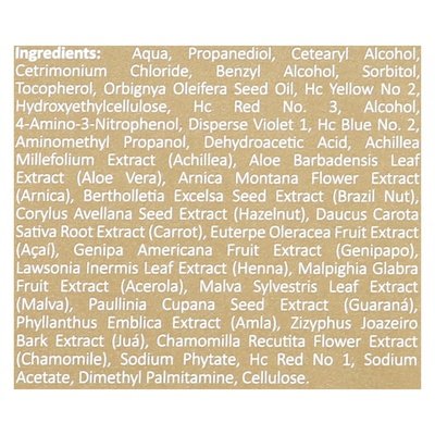INGREDIENTS: Aqua, Propanediol, Cetearyl Alcohol, Cetrimonium Chloride, Benzyl Alcohol, Sorbitol, Tocopherol, Orbignya Oleifera Seed Oil, Hc Yellow 2, Hydroxyethylcellulose, Hc Red 3, Alcohol, 4-Amino-3-Nitrophenol, Disperse Violet 1, Hc Blue 2, Aminomethyl Propanol, Dehydroacetic Acid, Achillea Millefolium Extract (Achillea), Aloe Barbadensis Leaf Extract (Aloe Vera), Arnica Montana Flower Extract (Arnica), Bertholletia Excelsa Seed Extract (Brazil Nut), Corylus Avellana Seed Extract (Hazelnut), Daucus Carota Sativa Root Extract (Carrot), Euterpe Oferacea Fruit Extract (Acai), Genipa Americana Fruit Extract (Genipapo), Lawsonia Inermis Leaf Extract (Henna), Malpighia Glabra Fruit Extract (Acerola), Malva Sylvestris Leaf Extract (Malva), Paullinia Cupana Seed Extract (Guarana), Phyllanthus Emblica Extract (Amla), Zizyphus Joazeiro Bark Extract (Jua), Chamomilla Recutita Flower Extract (Chamomile), Sodium Phytate, Hc Red 1, Sodium, Acetate, Dimethyl Palmitamine, Cellulose.