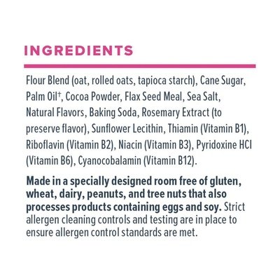 INGREDIENTS: Flour Blend (Oat, Rolled Oats, Tapioca Starch), Cane Sugar, Palm Oil (Sustainably Sourced, RSPO Certified), Cocoa Powder, Flax Seed Meal, Sea Salt, Natural Flavors, Baking Soda, Rosemary Extract (to Preserve Flavor), Sunflower Lecithin, Thiamin (Vitamin B1), Riboflavin (Vitamin B2), Niacin (Vitamin B3), Pyridoxine HCl (Vitamin B6), Cyanocobalamin (Vitamin B12).
