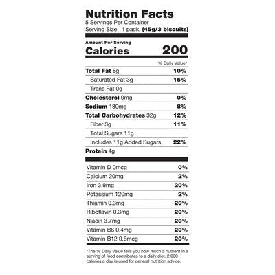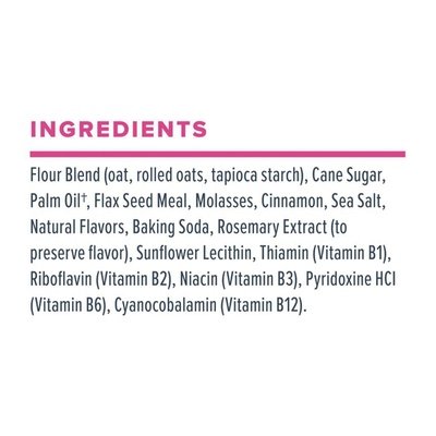 INGREDIENTS: Flour Blend (Oat, Rolled Oats, Tapioca Starch), Cane Sugar, Palm Oil (Sustainably Sourced, RSPO Certified), Flax Seed Meal, Molasses, Cinnamon, Sea Salt, Natural Flavors, Baking Soda, Rosemary Extract (to Preserve Flavor), Sunflower Lecithin, Thiamin (Vitamin B1), Riboflavin (Vitamin B2), Niacin (Vitamin B3), Pyridoxine HCl (Vitamin B6), Cyanocobalamin (Vitamin B12).