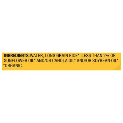 INGREDIENTS: Water, Long Grain Rice (Organic); Less than 2% of: Sunflower Oil (Organic) and/or Canola Oil (Organic) and/or Soybean Oil (Organic).