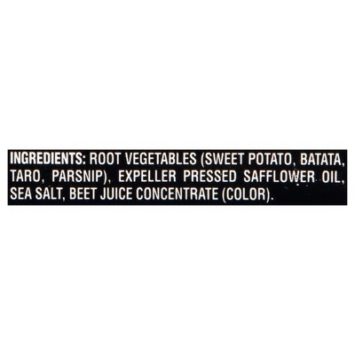 INGREDIENTS: Root Vegetables (Sweet Potato, Batata, Taro, Parsnip), Expeller Pressed Safflower Oil, Sea Salt, Beet Juice Concentrate (Color).