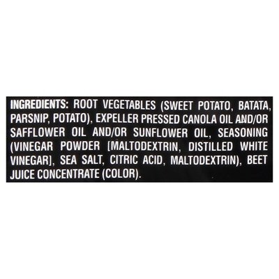 INGREDIENTS: Root Vegetables (Sweet Potato, Batata, Parsnip, Potato), Expeller Pressed Canola Oil and/or Safflower Oil and/or Sunflower Oil, Seasoning (Vinegar Powder [Maltodextrin, Distilled White Vinegar], Sea Salt, Citric Acid, Maltodextrin), Beet Juice Concentrate (Color).