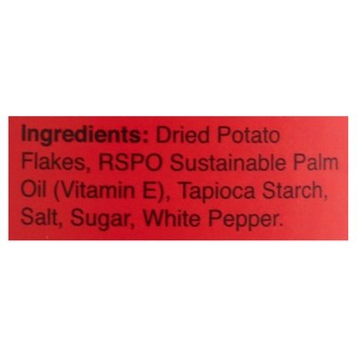 INGREDIENTS: Dried Potato Flakes, RSPO Sustainable Palm Oil (Vitamin E), Tapioca Starch, Salt, Sugar, White Pepper.