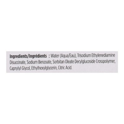 INGREDIENTS: Water, Trisodium Ethylenediamine Disuccinate, Sodium Benzoate, Sorbitan Oleate Decylglucoside Crosspolymer, Caprylyl Glycol, Ethylhexylglycerin, Citric Acid.
