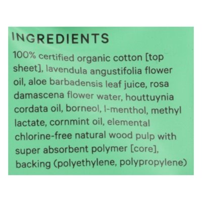 INGREDIENTS: 100% Certified Organic Cotton [Top Sheet], Lavendula Angustifolia Flower Oil, Aloe Barbadensis Leaf Juice, Rosa Damascena Flower Water, Houttuynia Cordata Oil, Borneol, L-Menthol, Methyl Lactate, Cornmint Oil, Elemental Chlorine-Free Natural Wood Pulp with Super Absorbent Polymer [Core], Backing (Polyethylene, Polypropylene).