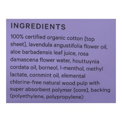 INGREDIENTS: 100% Certified Organic Cotton [Top Sheet], Lavendula Angustifolia Flower Oil, Aloe Barbadensis Leaf Juice, Rosa Damascena Flower Water, Houttuynia Cordata Oil, Borneol, I-Menthol, Methyl Lactate, Cornmint Oil, Elemental Chlorine-Free Natural Wood Pulp with Super Absorbent Polymer [Core], Backing (Polyethylene, Polypropylene).