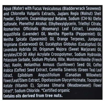 INGREDIENTS: Pure Ingredients: Aqua (Water) with Fucus Vesiculosus (Bladderwrack Seaweed) and Chlorella Vulgaris Extracts, Juglans Regia (Walnut) Shell Powder, Glycerin, Cocamidopropyl Betaine, Sodium (C14-16) Olefin Sulfonate, Phenethyl Alcohol, Ethylhexylglycerin, Triethyl Citrate, Rosmarinus Officinalis (Rosemary) Leaf Extract, Lavandula Angustifolia (Lavender) Oil, Mentha Piperita (Peppermint) Oil, Mentha Spicata (Spearmint) Oil, Orange Terpenes, Juniperus Virginiana (Cedarwood) Oil, Eucalyptus Globulus (Eucalyptus) Oil, Lavandula Hybrida Oil, Origanum Majora (Sweet Marjoram) Oil, Acrylates/C10-30 Alkyl Acrylate Crosspolymer, Sodium Hydroxide, Potassium Sorbate, Sodium Phytate, Illite, Montmorillonite (French Clay), Kaolin, Helianthus Annuus (Sunflower) Seed Oil, Coffea Arabica (Coffee) Seed Extract, Camellia Sinensis (Green Teal Leaf Extract, Epilobium Angustifolium (Canadian Willowherb) Flower/Leaf/Stem Extract, Dipotassium Glycyrrhizinate, Tocopheryl Acetate (Vitamin E), Spiraea Ulmaria (Meadowsweet) Flower Extract (Certified Organic), Sodium Chloride.