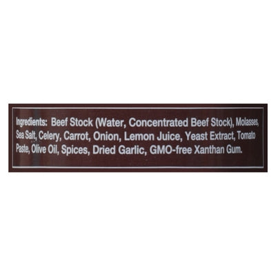 INGREDIENTS: Beef Stock (Water, Concentrated Beef Stock), Molasses, Sea Salt, Celery, Carrot, Onion, Lemon Juice, Yeast Extract, Tomato Paste, Olive Oil, Spices, Dried Garlic, GMO-Free Xanthan Gum.