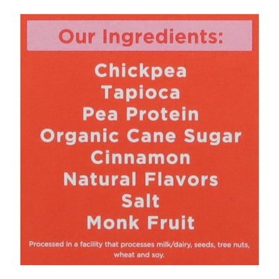 INGREDIENTS: Our Ingredients: Chickpea, Tapioca, Pea Protein, Organic Cane Sugar, Cinnamon, Natural Flavors, Salt, Monk Fruit.