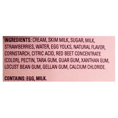 INGREDIENTS: Cream, Skim Milk, Sugar, Milk, Strawberries, Water, Egg Yolks, Natural Flavor, Cornstarch, Citric Acid, Red Beet Concentrate (Color), Pectin, Tara Gum, Guar Gum, Xanthan Gum, Locust Bean Gum, Gellan Gum, Calcium Chloride.