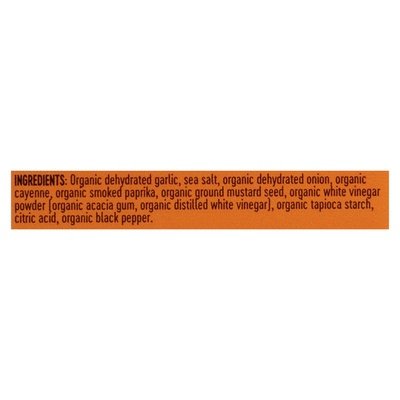 INGREDIENTS: Organic Dehydrated Garlic, Sea Salt, Organic Dehydrated Onion, Organic Cayenne, Organic Smoked Paprika, Organic Ground Mustard Seed, Organic White Vinegar Powder (Organic Acacia Gum, Organic Distilled White Vinegar), Organic Tapioca Starch, Citric Acid, Organic Black Pepper.