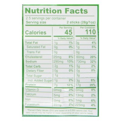 PRODUCT DETAILS: 7 g protein per serving. 1 g total sugar per serving. Certified gluten free. Certified Paleo. Sticks made with all-natural (no artificial ingredients. Minimally processed. Vegetarian fed) turkey raised without added hormones (federal regulations prohibit the use of hormones in turkey) or antibiotics. You are what you eat. Choose wisely. Inspected for wholesomeness by U.S. Department of Agriculture. www.thenewprimal.com. Tear because we care. Learn more at thenewprimal.com. Nutritional information available at www.thenewprimal.com.