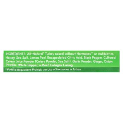 INGREDIENTS: All-Natural (No Artificial Ingredients, Minimally Processed, Vegetarian Fed) Turkey Raised Without Hormones (Federal Regulations Prohibit the Use of Hormones in Turkey) or Antibiotics, Honey, Sea Salt, Lemon Peel, Encapsulated Citric Acid, Black Pepper, Cultured Celery Juice Powder (Celery Powder, Sea Salt), Garlic Powder, Ginger, Onion Powder, White Pepper, in Beef Collagen Casing.