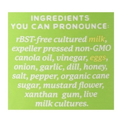 INGREDIENTS: Ingredients You Can Pronounce: rBST-Free Cultured Milk, Expeller Pressed Non-GMO Canola Oil, Vinegar, Eggs, Onion, Garlic, Dill, Honey, Salt, Pepper, Organic Cane Sugar, Mustard Flower, Xanthan Gum, Live Milk Cultures.