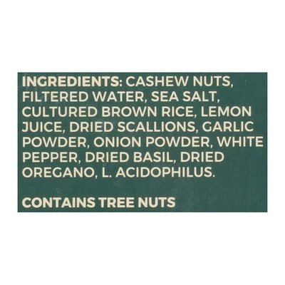 INGREDIENTS: Cashew Nuts, Filtered Water, Sea Salt, Cultured Brown Rice, Lemon Juice, Dried Scallions, Garlic Powder, Onion Powder, White Pepper, Dried Basil, Dried Oregano, L. Acidophilus.