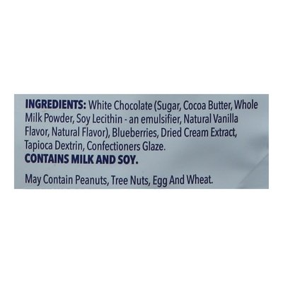 INGREDIENTS: White Chocolate (Sugar, Cocoa Butter, Whole Milk Powder, Soy Lecithin - an Emulsifier, Natural Vanilla Flavor, Natural Flavor), Blueberries, Dried Cream Extract, Tapioca Dextrin, Confectioners Glaze.