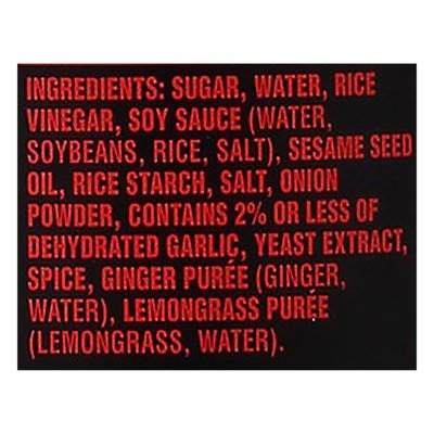 DESCRIPTION: Sultry & spicy, with garlic, ginger & cilantro. Gluten free. May be produced with genetic engineering. Since 1987, House of Tsang products have been known for their traditional Asian ingredients. Today, these authentic, flavorful sauces are a deliciously convenient way to create your favorite Asian specialties at home. www.houseoftsang.com. Questions or comments, please call 1-800-611-9782. For great recipes visit www.houseoftsang.com. < Sugar, Water, Rice Vinegar, Soy Sauce (Water, Soybeans, Rice, Salt), Sesame Seed Oil, Rice Starch, Salt, Onion Powder, Contains 2% or Less of Garlic, Yeast Extract, Spice, Ginger Puree (Ginger, Water), Lemongrass Puree (Lemongrass, Water).
