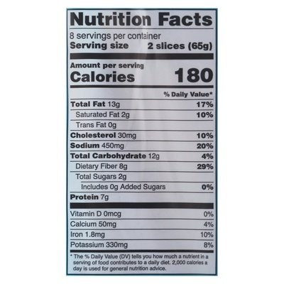 PRODUCT DETAILS: 4 g (Net carbs include only those carbohydrates that have measurable impact on blood sugar levels) net carbs (Per 2 slices - 65 g serving). 7 g protein (Per 2 slices - 65 g serving). 8 g fiber (Per 2 slices - 65 g serving). 12 g total carbs - fiber 8 g = net carbs 4 g. Keto certified. Certified Gluten-free. Gluten-free. Grain-free. Certified paleo. Deliciously uncompromising. How can something that is grain and gluten-free be so satisfying? It starts with a simple recipe and high quality, nutritious ingredients, made without compromise on taste or texture. Enjoy the simple goodness! unbunfoods.com. Facebook. Instagram. Product of Canada.