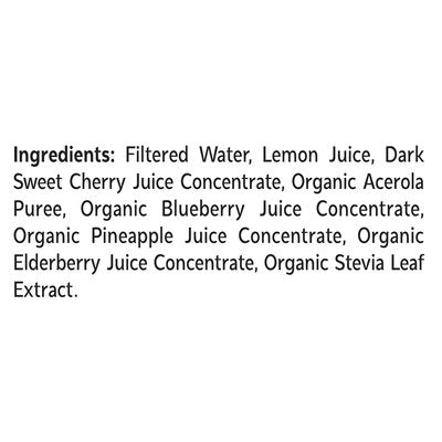 INGREDIENTS: Filtered Water, Lemon Juice, Dark Sweet Cherry Juice Concentrate, Organic Acerola Puree, Organic Blueberry Juice Concentrate, Organic Pineapple Juice Concentrate, Organic Elderberry Juice Concentrate, Organic Stevia Leaf Extract.