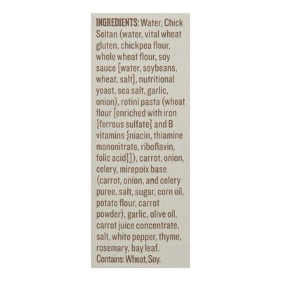 INGREDIENTS:  Water, Chick Seitan (Water, Vital Wheat Gluten, Chickpea Flour, Whole Wheat Flour, Soy Sauce [Water, Soybeans, Wheat, Salt], Nutritional Yeast, Sea Salt, Garlic, Onion), Rotini Pasta (Wheat Flour [Enriched with Iron Ferrous Sulfatel and B Vitamins Niacin, Thiamine Mononitrale, Riboflavin, Folic Acid), Carrot, Onion, Celery, Mirepoix Base (Carrot, Onion, and Celery Puree, Salt, Sugar, Corn Oil, Potato Flour, Carrot Powder), Garlic, Olive Oil, Carrot Juice Concentrate, Salt, White Pepper, Thyme, Rosemary, Bay Leaf.