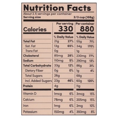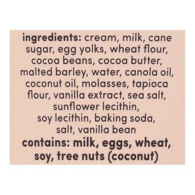 INGREDIENTS: Cream, Milk, Cane Sugar, Egg Yolks, Wheat Flour, Cocoa Beans, Cocoa Butter, Malted Barley, Water, Canola Oil, Coconut Oil, Molasses, Tapioca Flour, Vanilla Extract, Sea Salt, Sunflower Lecithin, Soy Lecithin, Baking Soda, Salt, Vanilla Bean.