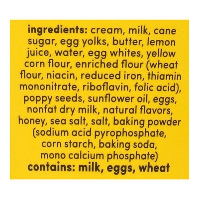 INGREDIENTS: Cream, Milk, Cane Sugar, Egg Yolks, Butter, Lemon Juice, Water, Egg Whites, Yellow Corn Flour, Enriched Flour (Wheat Flour, Niacin, Reduced Iron, Thiamin Mononitrate, Riboflavin, Folic Acid), Poppy Seeds, Sunflower Oil, Eggs, Nonfat Dry Milk, Natural Flavors, Honey, Sea Salt, Salt, Baking Powder (Sodium Acid Pyrophosphate, Corn Starch, Baking Soda, Mono Calcium Phosphate).