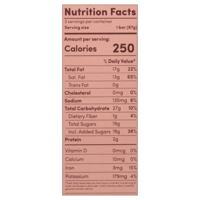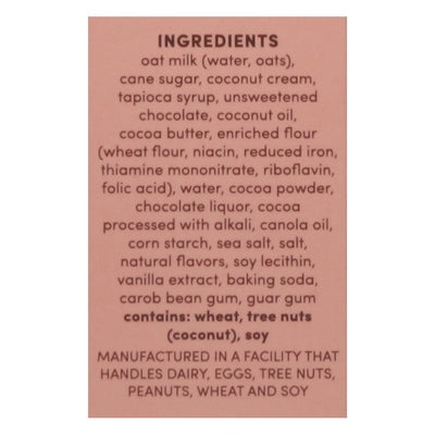 INGREDIENTS: Oat Milk (Water, Oats), Cane Sugar, Coconut Cream, Tapioca Syrup, Unsweetened Chocolate, Coconut Oil, Cocoa Butter, Enriched Flour (Wheat Flour, Niacin, Reduced Iron, Thiamine Mononitrate, Riboflavin, Folic Acid), Water, Cocoa Powder, Chocolate Liquor, Cocoa Processed with Alkali, Canola Oil, Corn Starch, Sea Salt, Salt, Natural Flavors, Soy Lecithin, Vanilla Extract, Baking Soda, Carob Bean Gum, Guar Gum.