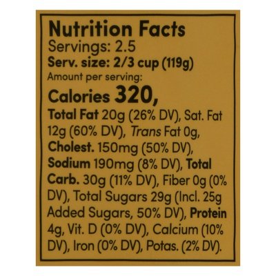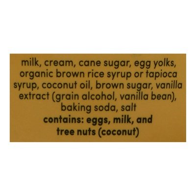 INGREDIENTS: Milk, Cream, Cane Sugar, Egg Yolks, Organic Brown Rice Syrup or Tapioca Syrup, Coconut Oil, Brown Sugar, Vanilla Extract (Grain Alcohol, Vanilla Bean), Baking Soda, Salt.