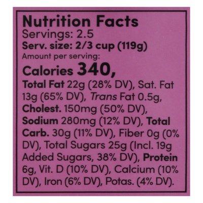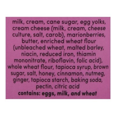INGREDIENTS: Milk, Cream, Cane Sugar, Egg Yolks, Cream Cheese (Milk, Cream, Cheese Culture, Salt, Carob), Marionberries, Butter, Enriched Wheat Flour (Unbleached Wheat, Malted Barley, Niacin, Reduced Iron, Thiamin Mononitrate, Riboflavin, Folic Acid), Whole Wheat Flour, Tapioca Syrup, Brown Sugar, Salt, Honey, Cinnamon, Nutmeg, Ginger, Tapioca Starch, Baking Soda, Pectin, Citric Acid.