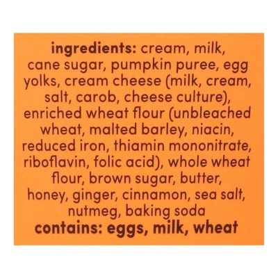 INGREDIENTS: Cream, Milk, Cane Sugar, Pumpkin Puree, Egg Yolks, Cream Cheese (Milk, Cream, Salt, Carob, Cheese Culture), Enriched Wheat Flour (Unbleached Wheat, Malted Barley, Niacin, Reduced Iron, Thiamin Mononitrate, Riboflavin, Folic Acid), Whole Wheat Flour, Brown Sugar, Buffer, Honey, Ginger, Cinnamon, Sea Salt, Nutmeg, Baking Soda.