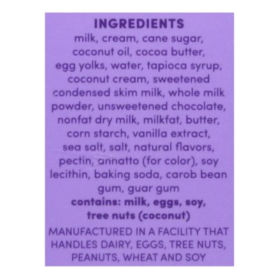 INGREDIENTS: Milk, Cream, Cane Sugar, Coconut Oil, Cocoa Butter, Egg Yolks, Water, Tapioca Syrup, Coconut Cream, Sweetened Condensed Skim Milk, Whole Milk Powder, Unsweetened Chocolate Nonfat Dry Milk, Milkfat, Butter, Corn Starch, Vanilla Extract, Sea Salt, Salt, Natural Flavors, Pectin, Annatto (for Color), Soy Lecithin, Baking Soda, Carob Bean Gum, Guar Gum.