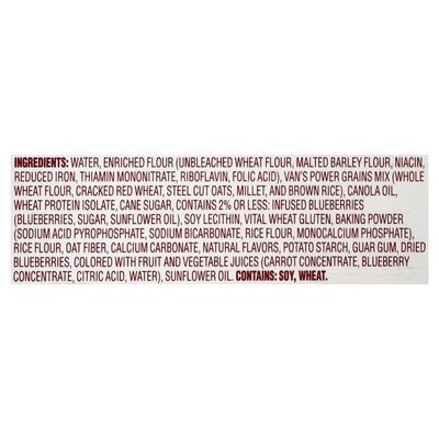 INGREDIENTS: Water, Enriched Flour (Unbleached Wheat Flour, Malted Barley Flour, Niacin, Reduced Iron, Thiamin Mononitrate, Riboflavin, Folic Acid), Van's Power Grains Mix (Whole Wheat Flour, Cracked Red Wheat, Steel Cut Oats, Millet, and Brown Rice), Canola Oil, Wheat Protein Isolate, Cane Sugar, Contains 2% or Less: Infused Blueberries (Blueberries, Sugar, Sunflower Oil), Soy Lecithin, Vital Wheat Gluten, Baking Powder (Sodium Acid Pyrophosphate, Sodium Bicarbonate, Rice Flour, Monocalcium Phosphate), Rice Flour, Oat Fiber, Calcium Carbonate, Natural Flavors, Potato Starch, Guar Gum, Dried Blueberries, Colored with Fruit and Vegetable Juices (Carrot Concentrate, Blueberry Concentrate, Citric Acid, Water), Sunflower Oil.