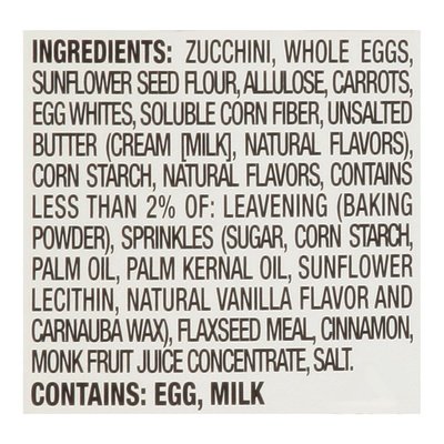 INGREDIENTS: Zucchini, Whole Eggs, Sunflower Seed Flour, Allulose, Carrots, Egg Whites, Soluble Corn Fiber, Unsalted Butter (Cream [Milk), Natural Flavors), Corn Starch, Natural Flavors, Contains Less than 2% of: Leavening (Baking Powder), Sprinkles (Sugar, Corn Starch, Palm Oil, Palm Kernal Oil, Sunflower Lecithin, Natural Vanilla Flavor and Carnauba Wax), Flaxseed Meal, Cinnamon, Monk Fruit Juice Concentrate, Salt.