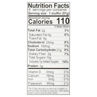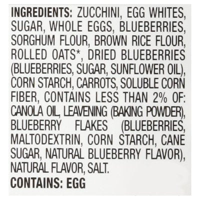 INGREDIENTS: Zucchini, Egg Whites, Sugar, Whole Eggs, Blueberries, Sorghum Flour, Brown Rice Flour, Rolled Oats (Certified Gluten Free) Dried Blueberries (Blueberries, Sugar, Sunflower Oil), Corn Starch, Carrots, Soluble Corn Fiber, Canola Oil, Leavening (Baking Powder), Flaxseed Meal, Blueberry Flakes (Blueberries, Cane Sugar, Natural Blueberry Flavor), Salt.
