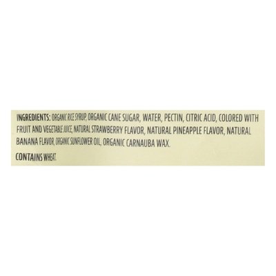 INGREDIENTS: Organic Rice Syrup, Organic Cane Sugar, Water, Pectin, Citric Acid, Colored with Fruit and Vegetable Juice, Natural Strawberry Flavor, Natural Pineapple Flavor, Natural Banana Flavor, Organic Sunflower Oil, Organic Carnauba Wax.