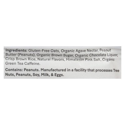 INGREDIENTS: Gluten-Free Oats, Organic Agave Nectar, Peanut Butter (Peanuts), Organic Brown Sugar, Organic Chocolate Liquor, Crisp Brown Rice, Natural Flavors, Himalayan Pink Salt, Organic Green Tea Caffeine.