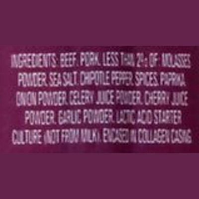 INGREDIENTS: Beef, Pork, Less than 2% of: Molasses Powder, Sea Salt, Chipotle Pepper, Spices, Paprika Onion Powder, Celery Juice Powder, Cherry Juice Powder, Garlic Powder, Lactic Acid Starter Culture (Not from Milk), Encased in Collagen Casing.