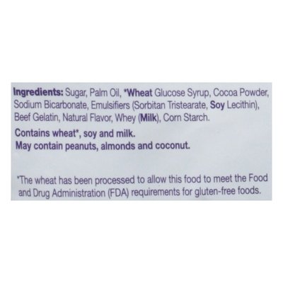 INGREDIENTS: Sugar, Palm Oil, Wheat Glucose Syrup (the Wheat Has Been Processed to Allow This Food to Meet the Food and Drug Administration [FDA] Requirements for Gluten-Free Foods), Cocoa Powder, Sodium Bicarbonate, Emulsifiers (Sorbitan Tristearate, Soy Lecithin), Beef Gelatin, Natural Flavor, Whey (Milk), Corn Starch.