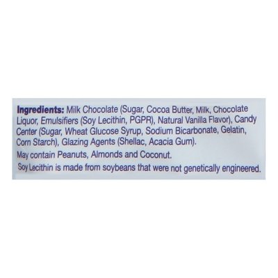 INGREDIENTS: Milk Chocolate (Sugar, Cocoa Butter, Milk, Chocolate Liquor, Emulsifier (Soy Lecithin, PGPR), Natural Vanilla Flavor), Candy Center (Sugar, Wheat Glucose Syrup, Sodium Bicarbonate, Gelatin, Corn Starch), Glazing Agents (Shellac, Acacia Gum).